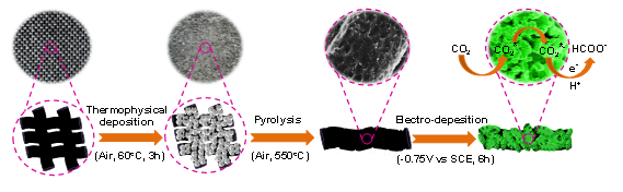 课题组针对此问题开展了相关研究,成功合成了生长于氮掺杂碳布上具有3D-蜂窝状结构的铜锡合金催化电极。该电极独特的形貌和缺陷位不仅有利于电解液的扩散,还可以作为特定空间用于限域CO2还原中间体, 同时为CO2还原提供更多的活性位点。基于此,CO2可跟随着电解液流入这种孔结构被充分还原,同时产物也可跟随电解液流出。另外,高导电性的氮掺杂碳布作为导电基底,有利于电子在基底和金属催化剂之间的界面有效传导。