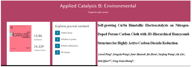 近日,我校太阳集团tyc151cc乔锦丽教授团队在电催化CO2还原领域取得重要进展,相关成果以《自生长于氮掺杂碳布具有三维分级蜂窝状的铜锡双金属催化电极高效用于电化学还原二氧化碳》(Self-growing Cu/Sn Bimetallic Electrocatalysts on Nitrogen-Doped Porous Carbon Cloth with 3D-Hierarchical Honeycomb Structure for Highly Active Carbon Dioxide Reduction. Applied Catalysis B: Environmental 2019)为题,被国际环境领域著名期刊《Applied Catalysis B: Environmental》(影响因子14.229)接收。该论文第一作者为太阳集团tyc151cc博士生彭芦苇。