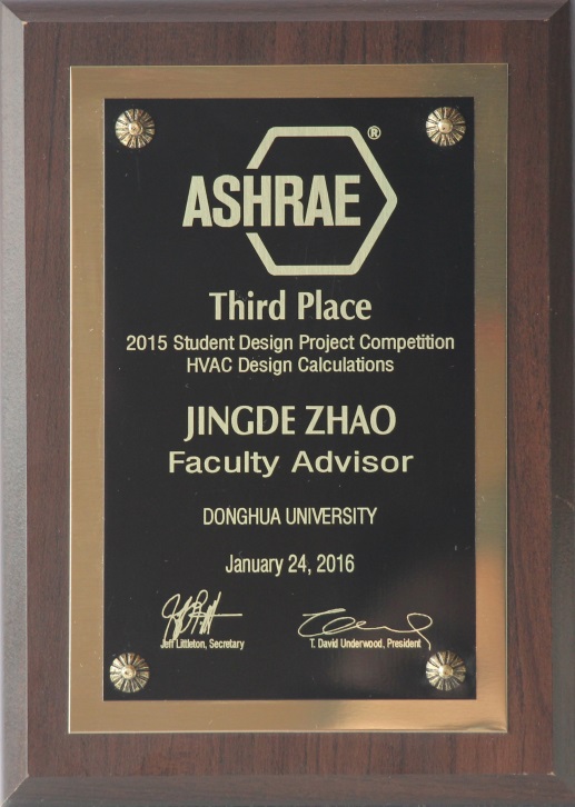指导学生设计竞赛是教学大纲之外的任务,对于指导教师业绩的帮助也不如论文和科研项目显著,但是却要占用指导教师们大量的课外时间,与学生一起调研、讨论、制图、参与竞赛答辩等各个环节。有的设计竞赛是在暑假里提交最终作品,老师们就要放弃暑期休息,跟学生们一起奋斗,以求精益求精,完成一份完美的设计作品。指导教师们任劳任怨、不计报酬,在近十年的指导过程中,带领学生获得了多项国内外设计竞赛的奖项。比如2012年指导李林林、龚兰、王兰萍、曹浩淼和方芳团队获得第十届MDV中央空调设计应用大赛杰出设计奖和优秀指导教师奖;2015年指导卢思亮、黄宇蕊团队获得美国ASHRAE协会组织的全球Student Design Project Competition第三名;2016年指导陈思华、谈屹、吴兴、翟静团队获得CAR-ASHRAE学生设计竞赛三等奖。