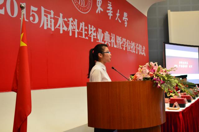 大家上午好!我是环境学院12级本科生卢圆圆,很荣幸能够代表环境学院全体在校学生,向即将离开母校的学长学姐们表达我们最真诚的问候和祝愿!并且对你们顺利完成学业,踏上人生新的旅程表示热烈的祝贺!