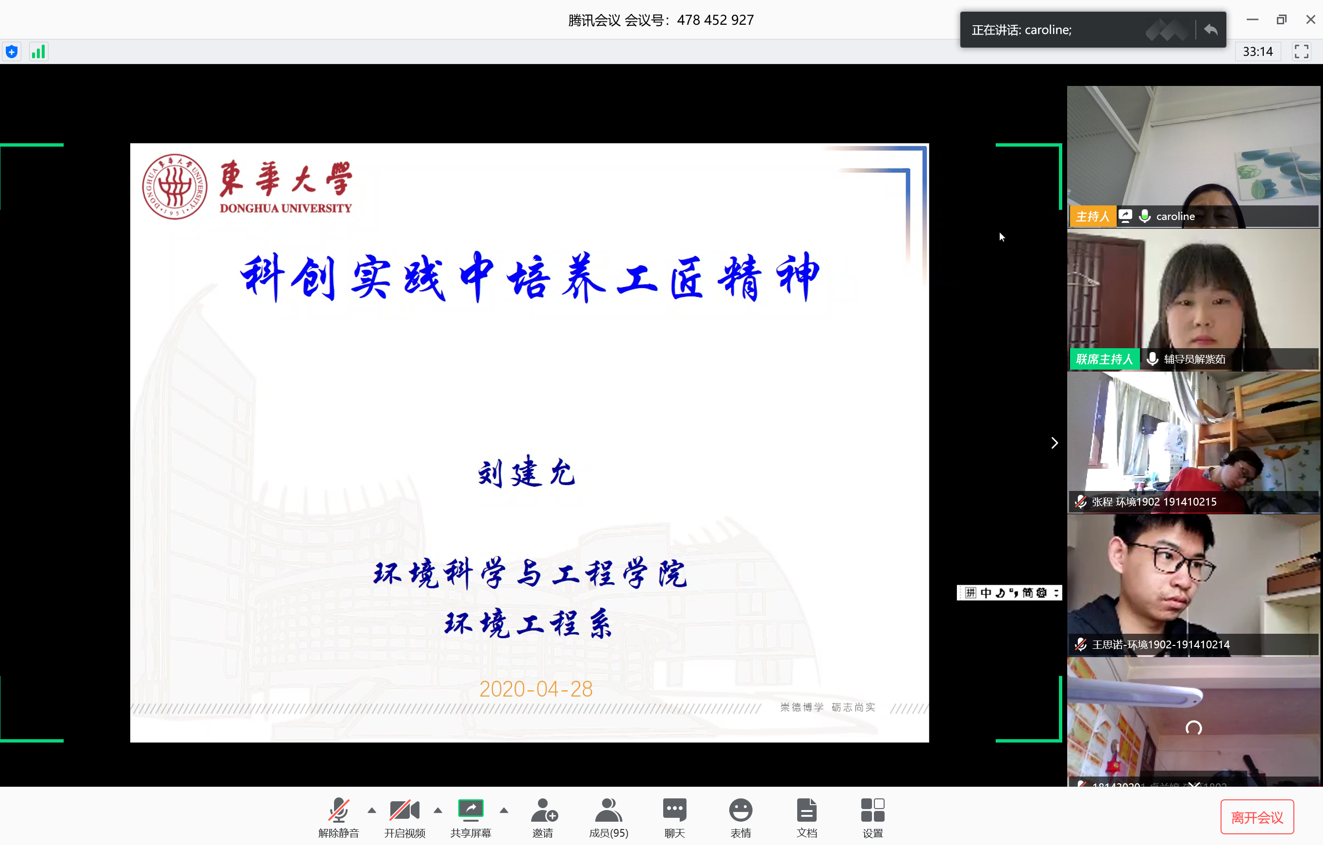 在疫情防控的特殊时期,环境学院积极探索线上讲座新方式,开启“教授讲坛”直播模式,借助腾讯会议平台,邀请刘建允老师与刘建麟老师举行了两场专业讲座,巧妙运用“屏幕共享”功能打破空间阻碍,引导大学生们关注时事、科学思考,加强知识的厚度与深度。19级班导师杨自力老师、辅导员解紫茹老师等环境学院200余名师生参加了讲座。