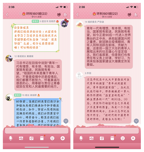 以“学习”为起点,环境学院积极组织各团支部开展线上学习和互动。环科1801团支部成员各自认真学习完习近平总书记给北京大学援鄂医疗队全体‘90后’党员回信后,主动在聊天群里发表各自的感悟。建筑1901团支部则选择通过线上直播的方式进行统一学习,学习完成后发表各自感想,并记录成文字版进行保存。通过学习,支部成员们了解到了青年一代正在发展成为建设新中国的中坚力量,青年兴则国家兴,青年强则国家强,大家作为青年一代,也应肩负起发展新中国的使命与责任。