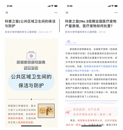(2)做“科普者”——云科普,自新冠病毒的疫情爆发以来,如何进行防护就倍受大家的关注。环境学院推出防疫知识系列,教授大家如何在疫情期间保护好自己,组织同上“疫情防控”思政大课,共同感受了中国抗疫彰显的中国共产党领导和中国特色社会主义制度的显著优势。疫情发生后,党中央、国务院高度重视,习近平总书记对疫情防控工作做了重要指示。中国科学家也开始快速甄别病原体、对病毒进行基因测序。环境科学和环境微生物专业的研究生们,通过云课堂也钻研了相关知识,并通过系列推送的方式传递了PCR技术的相关知识、野生动物禁止使用、医疗废物如何处置、垃圾分类千层“套路”之疫情版等等和疫情相关的专业性知识。