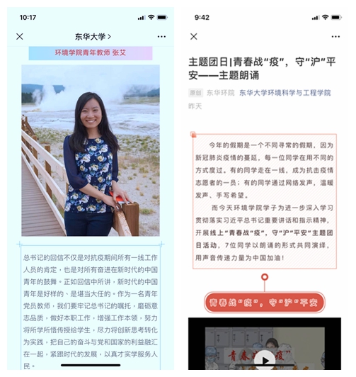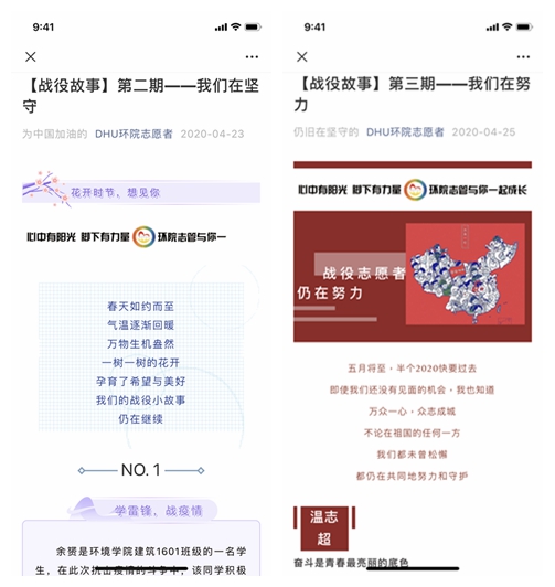 据悉,疫情期间,环境学院高度重视的青年学子的思想动态,通过易班、微信公众号等网络平台资源,宣传防疫知识,做好舆情监管,营造积极舆论氛围,激扬师生必胜信心,鼓励团员青年学习习近平总书记回信精神,“大事难事看担当,危难时刻显本色”,发挥团员青年生力军突击队作用。学院微信平台先后推出“奔走前线,环院志愿者有担当”“战疫故事”“抗疫征文”等系列推送,报道环院学子的战疫故事、感人事迹,展现环院学子怀揣着对打赢疫情防控阻击战的坚定信心,践行着新时代大学生的使命与担当。