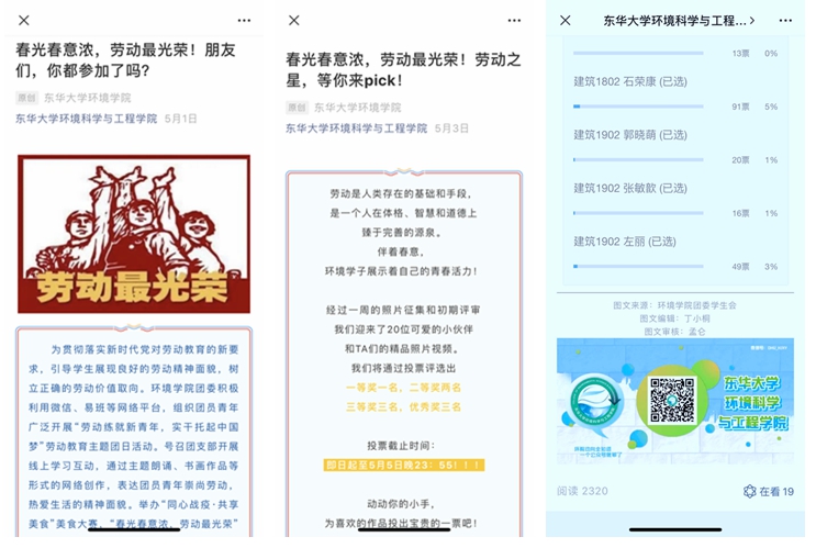 疫情期间,居家学习的同学们参加活动的热情高涨,经过为期二周的照片、视频征集,共收到来自本科生、研究生各年级共计40余份作品。这些作品展现着环境学子的积极乐观精神和崇尚劳动的良好品德。学生们的作品丰富多彩,扫地拖地洗碗洗衣,干出劳动精神;煎炸烹煮样样在行,做出厨艺天赋;健身锻炼打球跑步,练出运动习惯,经过评审委员会初评,20位同学的作品晋级线上人气投票环节。