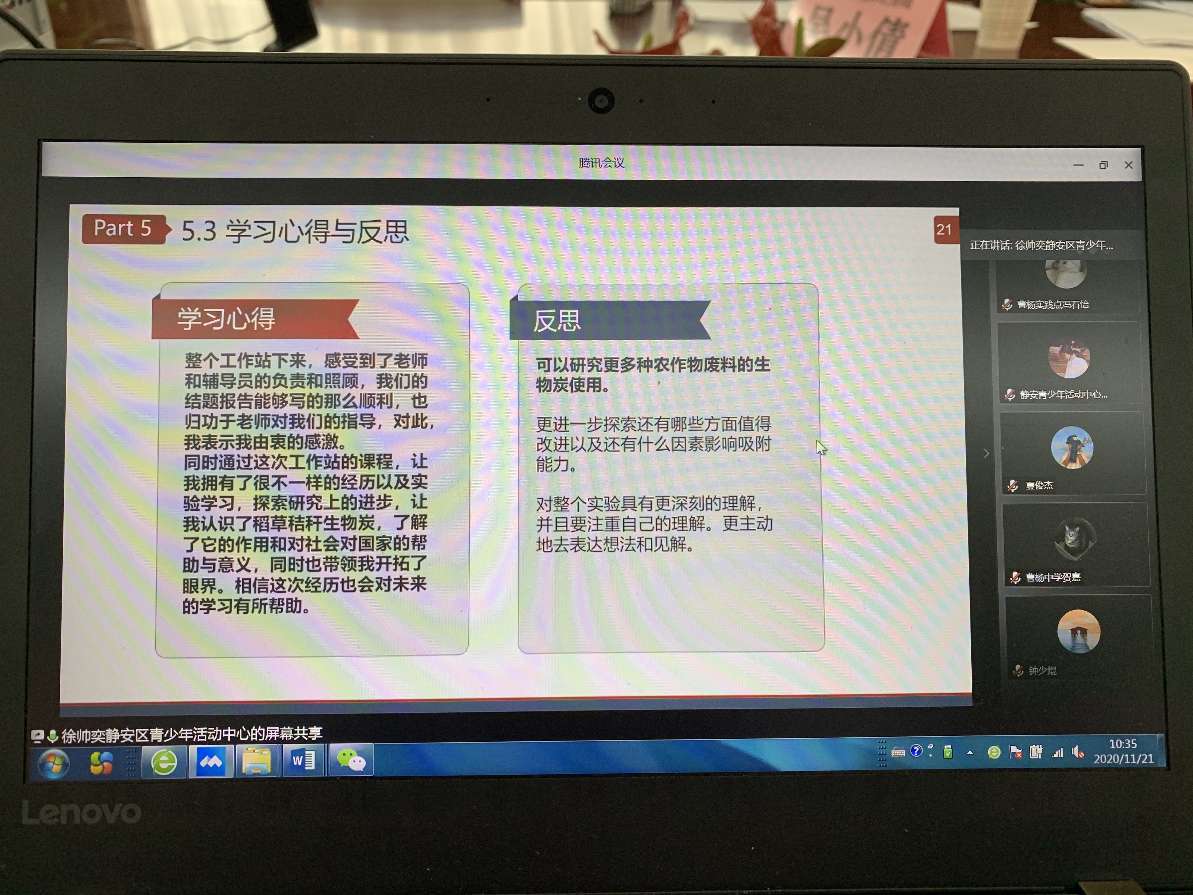 2020年度入站学生共计85人,今年7月学生正式进站,工作站遵循青少年成长需求、认知特点和创新实践教育规律,安排了科研方法、实验室安全、仪器认知等公共课程的学习。学生7至11人进入同一课题组进行研究,在每一个课题中3至4人为一研究小组,围绕环境相关的10个课题开展研究和探索,并及时进行开题指导、中期检查、结题答辩。由于疫情防控的原因,原定的后期线下进校实验取消,但这并未影响到学生对科研的热情以及工作站实验与教学工作的正常推进。为了让学生能更好地感受和体验实验过程,更能了解课题的内容,指导老师将线下实验改为线上实验录播视频演示,同样也别具特色。为保证育人质量,指导教师积极组织学生定期分享、辩论、反思与汇报,注重学生创新实践的过程培养,让学生受益匪浅。