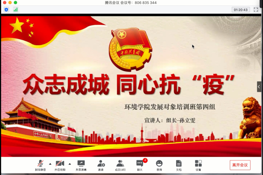 为深化发展对象对党的认识和理解,提高同学们的思想觉悟和党性修养,环境学院党委党校于2020年4月28日在腾讯会议平台开展环境学院“砥砺青春践初心,奋进东华诉真情”主题活动暨2020发展对象培训班结业检阅。环境学院学生党建负责人赵晖老师、环境学院本科生党支部书记胡昊、暖通学硕党支部书记董玉芳、环境学硕党支部副书记周添一、环境学院专硕党支部书记章基法共同出席了本次结业检阅。