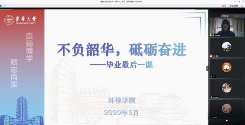 环境17硕“毕业最后一课”于5月7日举行,线上共63人参加。课程以“云端”思政的方式,分成四个部分。第一部分是爱国主义教育,重温全国上下齐心抗“疫”的整体历程,深刻体会在疫情大考中展现的制度优势;第二部分是感恩教育,回顾抗“疫”的身边故事,以及研究生期间的感人瞬间,感念师生、父母、同门、同学情谊,爱校荣校,引导学生怀抱感恩之心砥砺前行;第三部分是广阔天地,大有可为,号召环境学子将自身的命运与国家的发展紧密联系,坚持学以致用,做到知行合一,以天下为己任,修炼过硬本领;第四部分是文明离校。向毕业生发出倡议,疫情期间要严格按照学校的规定和要求,重规则,守底线,涵养品格,为学弟学妹做好榜样,让自己的学生生涯不留遗憾。会后,毕业生纷纷在线上发言,表达自己对于国家,对于母校,对于师长的感恩之情,并表示将牢记“崇德博学,砺志尚实”的校训,做一名优秀的东华学子。