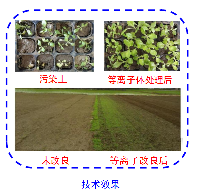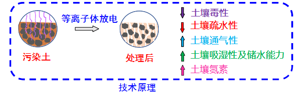 技术原理:利用低温等离子体原位空气放电产生的高能电子、氧自由基、紫外、超声等活性粒子和能量形式,可快 速有效降解土壤中多环芳烃、石油烃及卤代POPs等有机污染物,同时改良土壤,提高土壤生物承载力