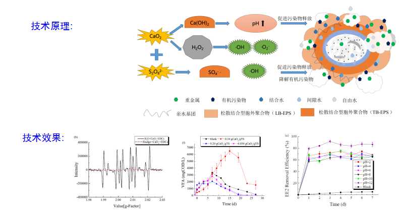 技术原理:利用过氧化钙与过硫酸盐改性复合药剂实现碱性-微氧-富钙-氧化环境,可有效促进污泥增溶减量、 促进污泥脱水、促进后期厌氧发酵产酸产甲烷,并同时实现污泥中难降解有机物及重金属的去除和钝化。