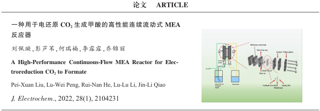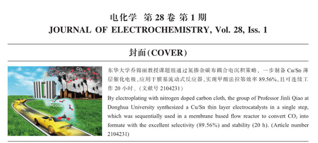 近日,我院乔锦丽教授课题组工作“一种用于电还原CO2生成甲酸的高性能连续流动式MEA反应器” (A High Performance Continuous Flow MEA Reactor for Electroreduction CO2 to Formate)被作为封面论文发表在《电化学》2022年第1期。