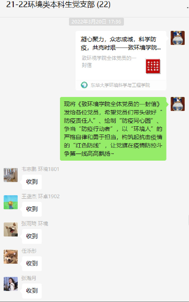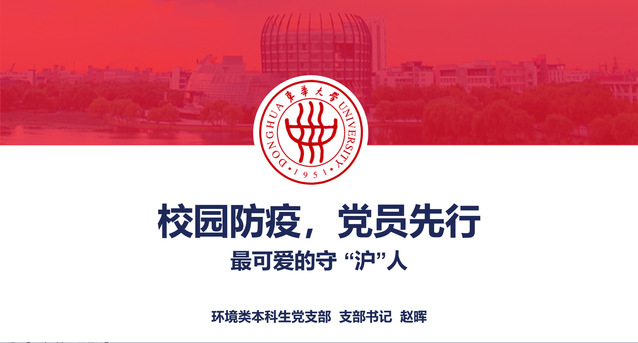 疫情爆发之初,环境类本科生党支部积极响应学院党委“凝心聚力,众志成城,科学防疫,共克时艰”的号召,迅速组织召开支部委员会,对支部后期党员政治理论学习、党员培养发展以及作用发挥等一系列的工作进行部署安排。支部书记率先垂范,认真准备线上党课内容,以“校园防疫,党员先行——最可爱的守‘沪’人”为题,号召支部党员以“环境人”的严格自律和勇于担当,构筑起抗击疫情的“红色防线”,让党旗在疫情防控斗争第一线高高飘扬。