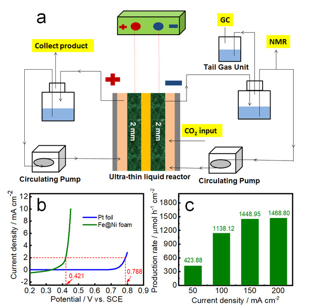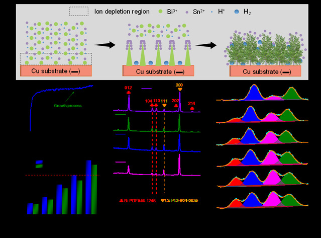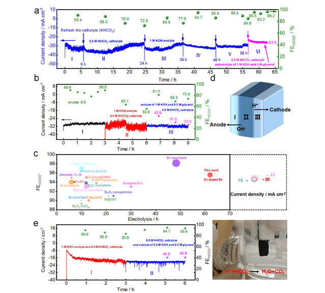电化学还原CO2成高附加值的燃料和化学品是一种非常具有前景的碳转化策略。在众多电催化CO2的产物中,甲酸作为制药和化工原料,便于工业储存和运输,并可作为理想的氢载体和液体燃料,也可以直接应用于甲酸燃料电池,但如何抑制析H2竞争反应,同时克服甲酸燃料从阴极到阳极的扩散损失是研究的难点。基于此,本工作首先详细研究了一种具有稳定微观结构的树枝状锡掺杂铋(Sn-doped-Bi)电极的生长过程及生长机理(图1)。独特形貌的锡掺杂铋电极可高效催化CO2至甲酸(图2),在电势窗口-0.83 ~ 0.93 V RHE时,可实现甲酸法拉第效率达95 %,长时间运行可超过60小时且电流密度可保持在30 mA cm-2。特别地,本工作进一步系统研究了: 1) 甲酸根从阴极到阳极的扩散问题以及2)超薄液流式反应器的设计理念和应用,并取得了系列研究成果(图3)。乔锦丽教授团队利用自制的双极膜可有效解决甲酸从阴极到阳极的扩散,同时超薄液流式反应器的应用可实现在100 mA cm-2的电流密度下稳定产1138.12 μmol h-1 cm-2的甲酸盐。先进电催化剂耦合超薄超薄液流式反应器和双极膜为提升CO2RR技术提供了全新的设计理念。论文的第一作者为我院博士生彭芦苇。