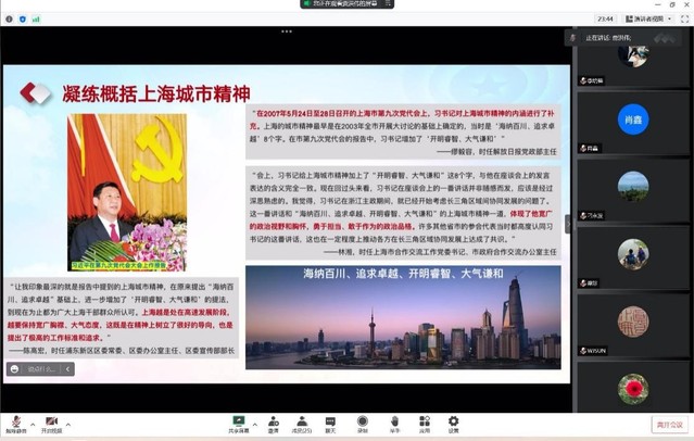 随后,与会的党员老师们踊跃发言,分享了学习《习近平在上海》、《当好改革开放的排头兵-习近平上海足迹》的心得体会与感悟收获。王宏伟分享了对国际化大都市的城市精神与发展理念的思考,他认为城市精神的本质是人的精神,改革开放这些年上海敢为人先、锐意进取,不断开创新局面、取得新成绩,恰恰体现出上海人民的精神本质;朱延平分享了读本中“上海城市精神”和“排头兵”精神对个人成长的启发,表示将以“稳定、平和”的积极心态开展工作,时刻牢记“大局为重、甘于奉献”的主人翁意识;范日东同样分享了对“排头兵”的理解,他认为应当从改革创新的视角来审视高校排名和科技工作者成果;王会以PPT的形式分享了对习近平同志典雅通俗幽默且有力的表达文风的理解,她表示作为党员教师,会努力将其与教学科研工作结合,做到多读书、勤思考、常实践;杨自力分享了习近平总书记站在国家大局看上海发展问题对自己的启发,习近平总书记的谆谆嘱托更坚定了他科技报国的信心。
