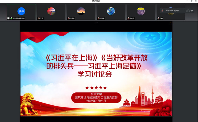 为迎接二十大胜利召开,引导支部党员深刻认识“两个确立”的决定性意义,争当“两个维护”示范引领者,按照学校、学院党委要求,2022年8月23日下午,环境学院建环系党支部开展学习讨论会,集体学习《习近平在上海》、《当好改革开放的排头兵-习近平上海足迹》。支部全体党员教师参加学习,会议由支部书记贾洪伟主持。