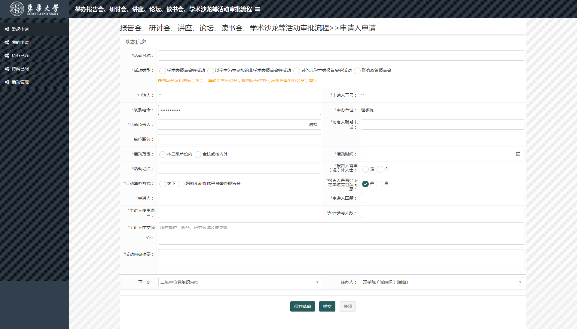 2、点左侧【发起申请】,在右侧表单中,填写活动的各项内容。注意:最底下的【经办人】请选择本部门对应负责人。