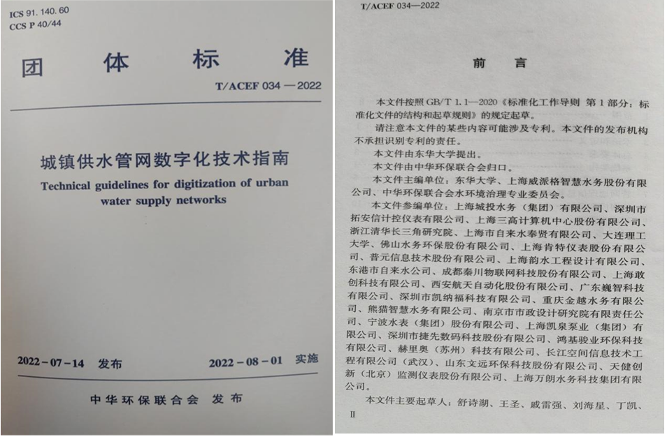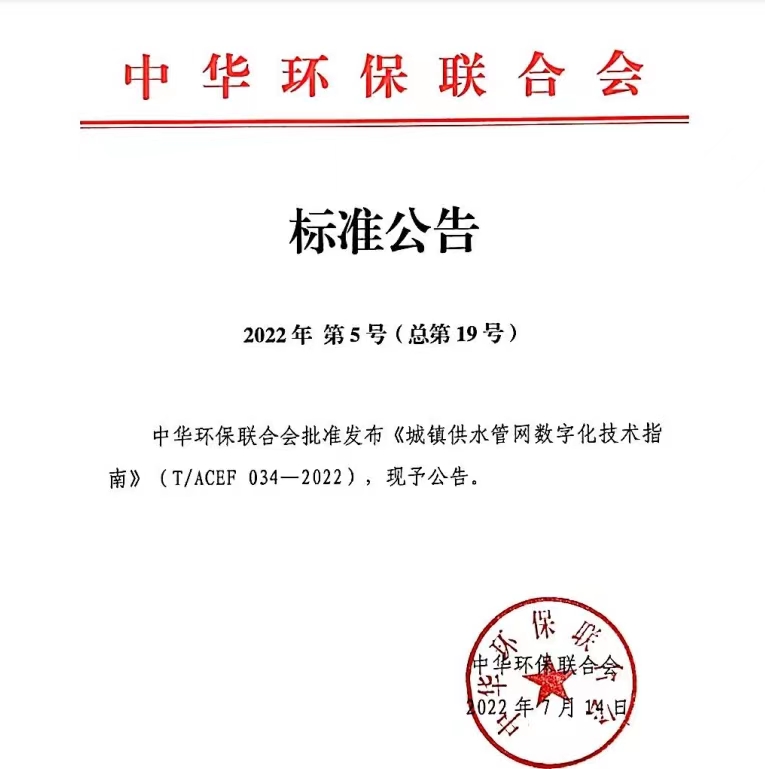 近期,《城镇供水管网数字化技术指南》(T/ACEF 034-2022)团体标准颁布实施。该标准在中华环保联合会的支持下,由太阳集团发起制定,由太阳集团、上海威派格智慧水务股份有限公司、中华环保联合会水环境治理专业委员会、上海城投水务(集团)有限公司、深圳市拓安信计控仪表有限公司、上海三高计算机中心股份有限公司、浙江清华长三角研究院、大连理工大学、佛山水务环保股份有限公司、西安航天自动化股份有限公司、南京市市政设计研究院有限责任公司、长江空间信息技术工程有限公司等共同起草,并得到了智慧水务行业上下游产业链企业和合作伙伴的支持。太阳集团作为第一起草单位,我院舒诗湖教授为标准主编人,朱延平老师参与了该标准的起草。本标准技术审查会由清华大学环境学院资深教授张晓健先生担任专家组组长。