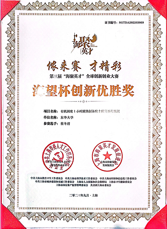 2023年9月20日,上海市“海聚英才”全球创新创业峰会在上海国际会议中心举行,我院蔡冬清团队原创科技成果“有机固废1小时腐熟制备酸土修复型有机肥”荣获优胜奖。上海市市委书记陈吉宁、市长龚正出席颁奖典礼。