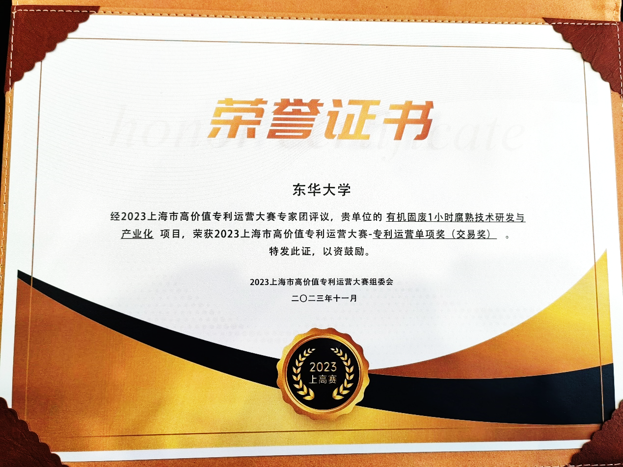 11月16日,由上海市知识产权局、上海市科学技术委员会、上海市教育委员会指导,上海技术交易所、上海市高校科技发展中心、上海市知识产权服务中心联合主办的上海市高价值专利大赛(简称“上高赛”)及颁奖典礼在上海国寿会议中心举行,我院蔡冬清团队自主研发的“有机固废1小时纳米腐熟技术研发与产业化”成果荣获“上海市高价值专利运营大赛标杆奖”(高校成长组“三强”)及“专利交易奖”。我校科研院成果转化处荣获“最佳服务奖”。