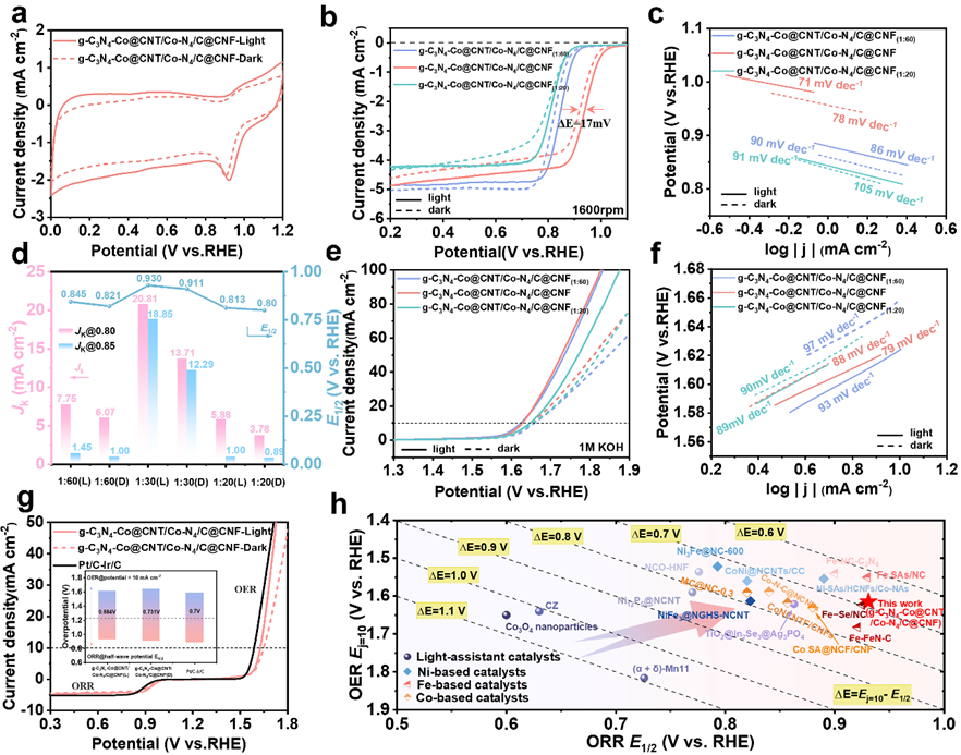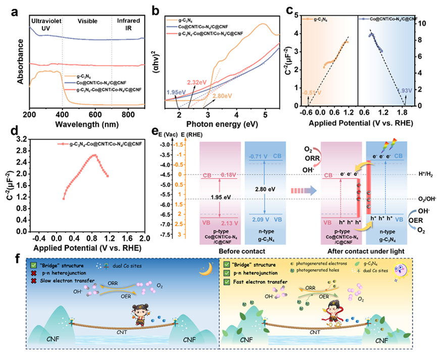 图3. (a) 紫外-可见光谱;(b) Tauc图;(c) g-C3N4和Co@CNT/Co-N4/C@CNF的Mott-Schottky图,以及(d) g-C3N4-Co@CNT/Co-N4/C@CNF的Mott-Schottky图; (e) g-C3N4-Co@CNT/Co-N4/C@CNF的能带结构及工作机制;(f) 氧还原反应/氧析出反应的光电子耦合机制示意图。