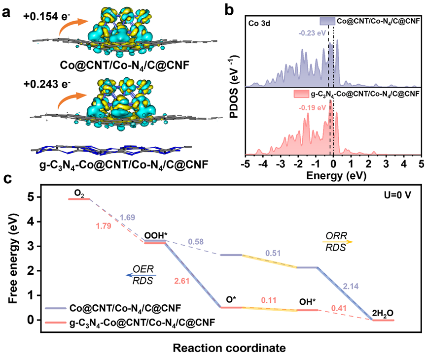 构建的p-n异质结增强了载流子分离,而分级结构支持双Co活性位点。这有效建立了双相增强系统,协同优化了结构耐久性和催化功能。优化后的g-C3N4-Co@CNT/Co-N4/C@CNF展现出卓越的双功能性能,其中氧还原反应(ORR)的半波电位(E1/2)为0.93 V,氧气进化反应(OER)的过电位(Ej:10)为1.614 V。密度泛函理论(DFT)计算表明,g-C3N4通过调节Co位点的局部电子结构,优化了氧中间体(O*-OH*)的吸附能。当作为 RZAB 系统中的阴极使用时,光增强型液态 RZAB 实现超 1100 小时的卓越循环寿命,提供高达310 mW cm−2的峰值功率密度。同时,光增强柔性RZABs展现出优异的宽角度范围的可折叠性(0°–180°–0°)和96 mW cm–2的功率密度。本研究提出了一种多功能合成平台,用于设计下一代光增强电催化剂,推动RZAB性能的边界。