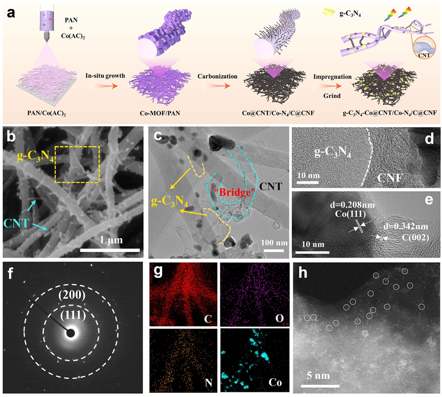 图1. (a) g-C3N4-Co@CNT/Co-N4/C@CNF的制备示意图;(b) 扫描电子显微镜(SEM)图像; (c) 透射电子显微镜(TEM)图像;(d, e) 高分辨率透射电子显微镜(HRTEM)图像;(f) 选区电子衍射(SAED)图案;(g) C、N、O、Co元素映射;以及 (h) HAADF-STEM图像。
