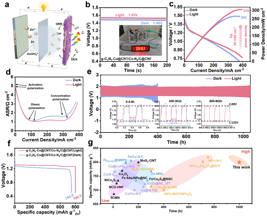 图5. (a)光增强型液体ZABs示意图;(b) 开路电压曲线;(c) 极化曲线及对应的功率密度; (d) ASR曲线;(e) 放电-充电循环曲线插图:电压效率);(f) 放电比容量;(g) 与近期报道的光增强型液体ZABs中催化剂的稳定性和比容量比较。