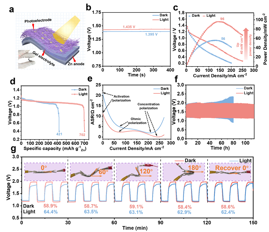 图6. (a) 光增强型柔性ZABs示意图;(b) 开路电压(OCV)曲线;(c) 放电极化曲线及对应的功率密度;(d) 放电比容量曲线; (e) ASR曲线;(f) 长期放电/充电循环性能;(g) 不同弯曲状态下的循环稳定性。