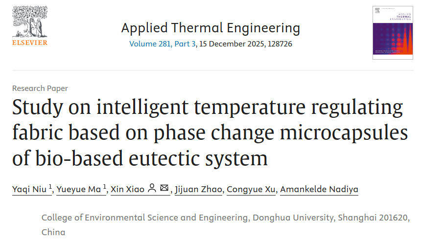 近日,我院肖鑫老师团队在基于相变微胶囊的智能调温织物的研究上取得进展,相关成果以“Study on intelligent temperature regulating fabric based on phase change microcapsules of bio-based eutectic system”为题在著名期刊《Applied Thermal Engineering》(中科院热力学一区,大类二区)发表(https://doi.org/10.1016/j.applthermaleng.2025.128726)。