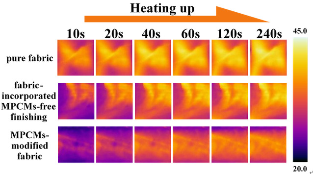 所得相变微胶囊呈现均匀球形核壳结构,平均粒径仅1.27μm,并结合改良浸渍印花技术,成功制备出兼具优异热调节性能、舒适度、使用耐久性的智能调温织物,其热滞后效率500%,冷却时105%。