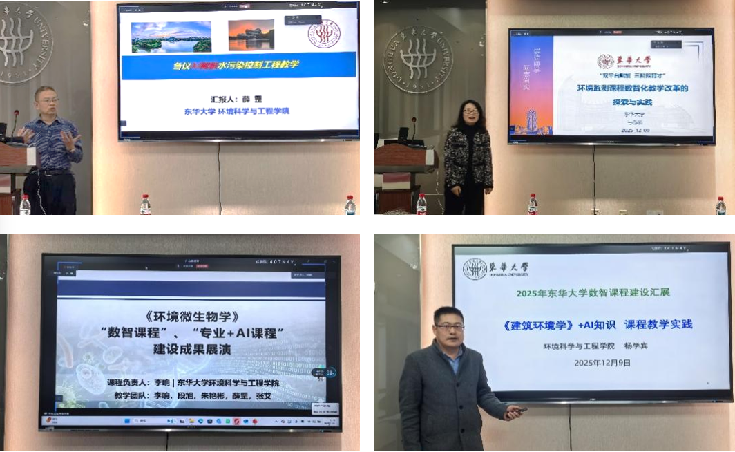 本次展演邀请薛罡、马春燕、李响、杨学宾四位教师别围绕《水污染控制工程(下)》《环境监测》《环境微生物学》《建筑环境学》四门一流课程,展示了各自在AI技术深度融合、教学流程优化及教学模式创新等方面的探索与实践。四位教师的分享内容详实、各具特色。薛罡教授聚焦AI赋能水污染控制工程教学,深入剖析了课程教学中的关键问题,系统梳理了AI在课程中的具体应用场景。马春燕副教授分享了《环境监测》课程的数智化教学改革实践,通过构建知识图谱、建立产教融合数据库等方式,推动教学实现从“经验驱动”向“数据驱动”的转型。李响教授展示了《环境微生物学》课程的线上资源知识库建设成果,通过精心设计创新课题,并依托AI技术高效处理真实项目案例,促进理论与实践深度融合。杨学宾副教授阐述了智能化管理融入建筑工程领域的必要性,分析了AI在数据获取处理与工程科学判断中的赋能价值,并结合实际教学中的AI互动案例,着力培养学生的创新思维。