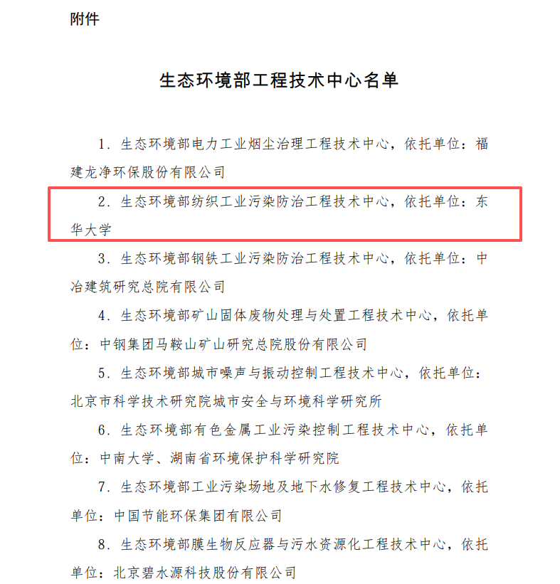 近日,生态环境部发布《关于公布生态环境部工程技术中心名单的通知》(环科财函〔2026〕17号),依托我校建设的生态环境部纺织工业污染防治工程技术中心顺利通过专项评估考核,纳入2026-2030年生态环境部工程技术中心运行管理名单。本年度生态环境部根据《生态环境部工程技术中心管理办法》,对2025年以前批复的38家工程技术中心开展了专项评估考核,经综合评定,30家工程技术中心通过考核。